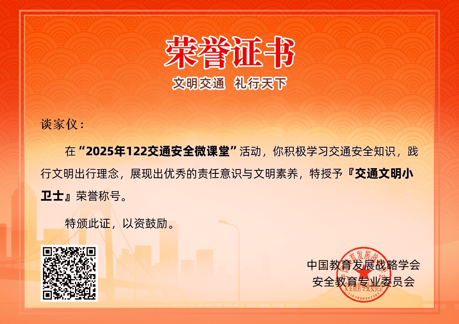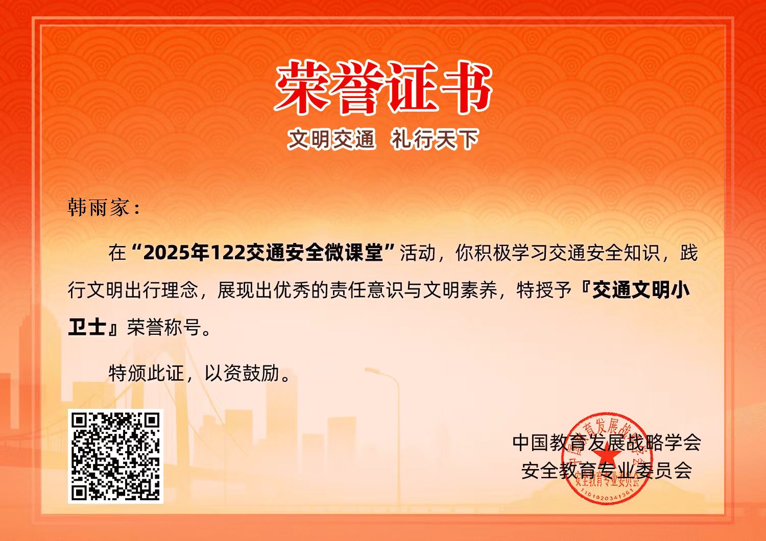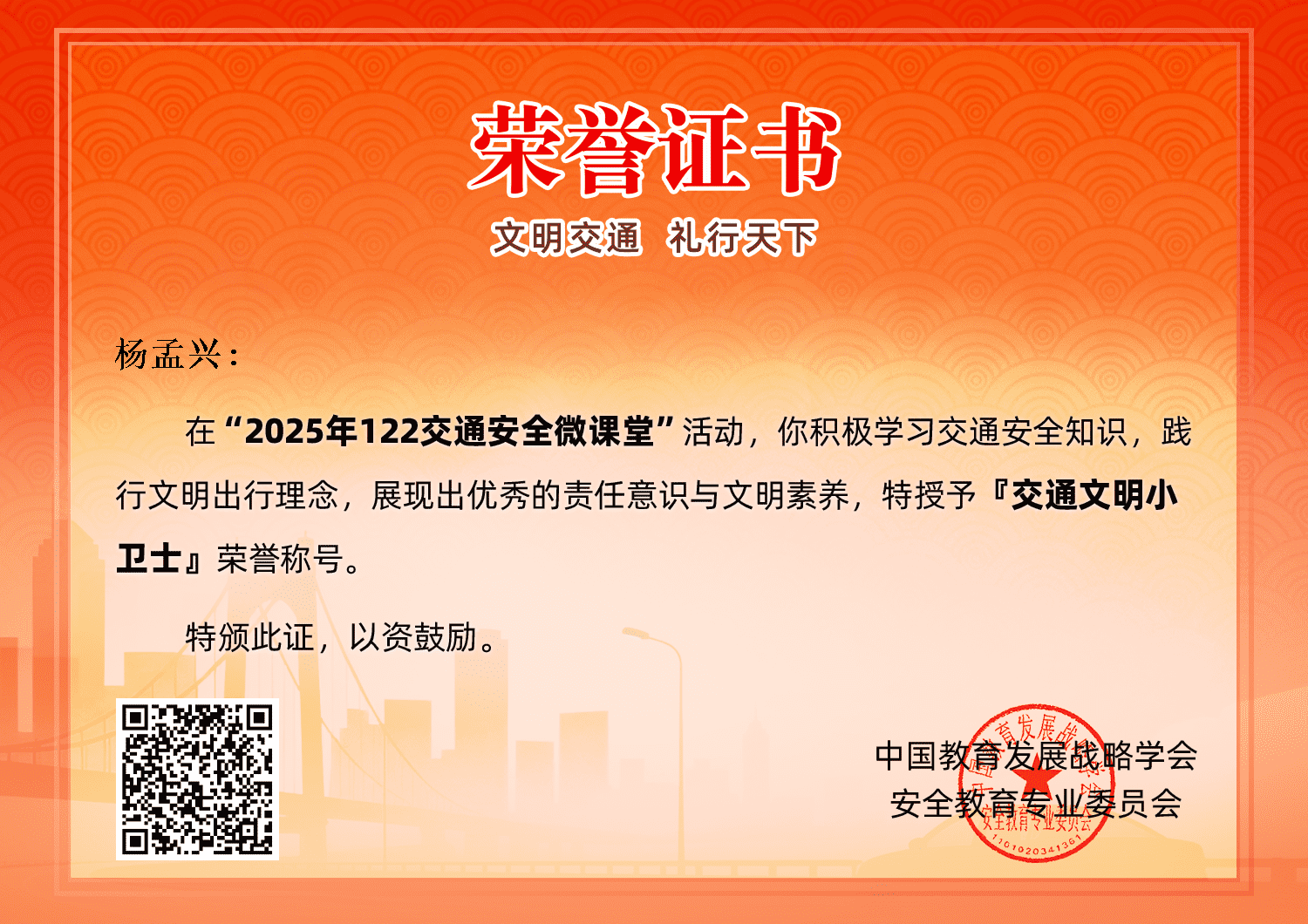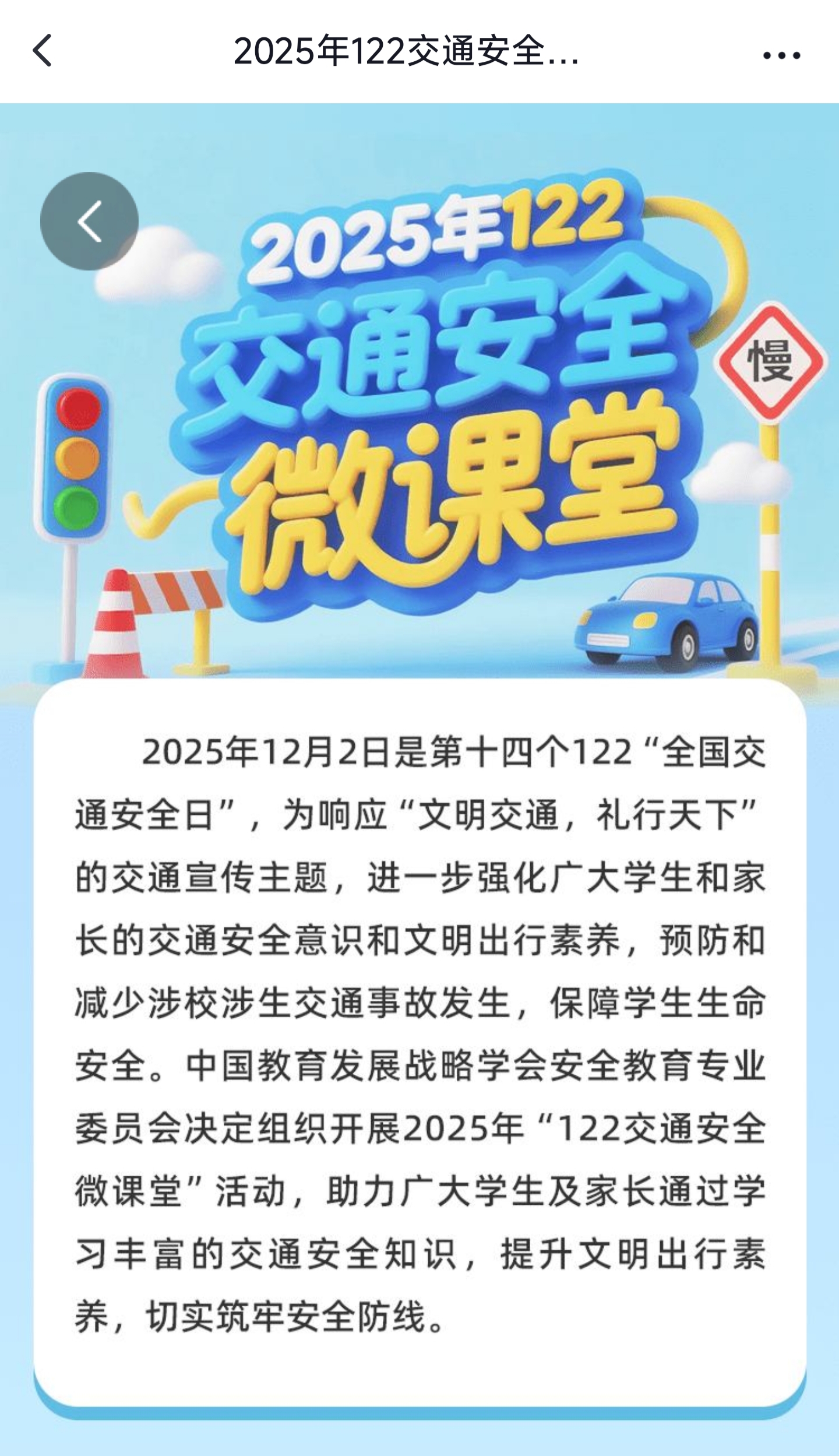 "文明交通,礼行天下"12月份安全交通志愿宣传活动 2025年12月2日是第14个122"全国交通安全日"请同学们和家长们都行动起来,积极响应"文明交通,礼行天下"的交通宣传主题,通过网络微课堂,文艺汇演,互动体验,案例宣讲等丰富多彩的方式开展志愿宣传活动。