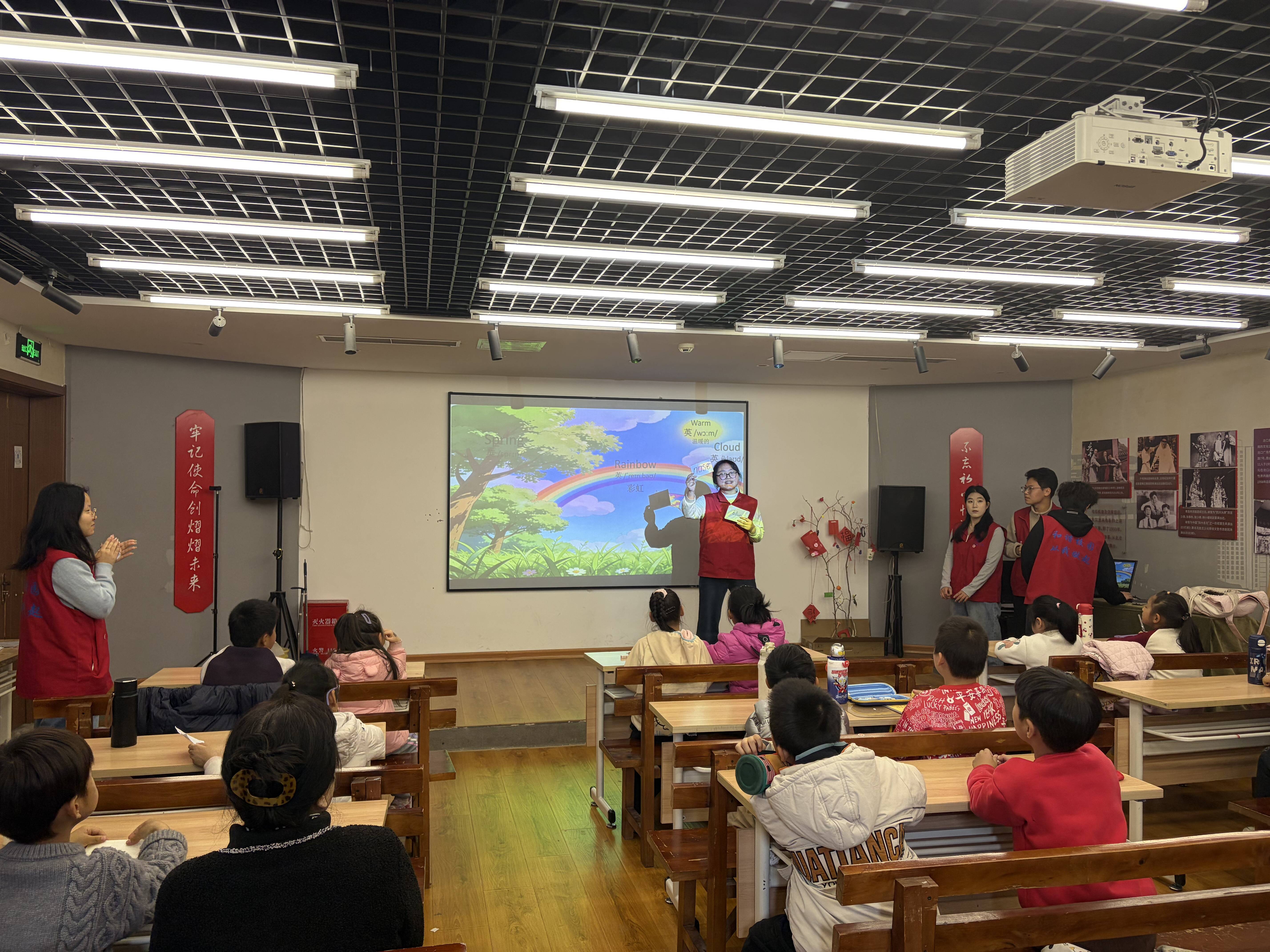 下午两点,实践所的活动室里,20余名小朋友们端坐聆听、眼神专注,在“小老师”的带领下,通过绘本故事、英文儿歌和互动游戏,开启了一场趣味英语之旅。孩子们从最初的羞涩拘谨,到争先恐后举手互动,课堂气氛渐入佳境。